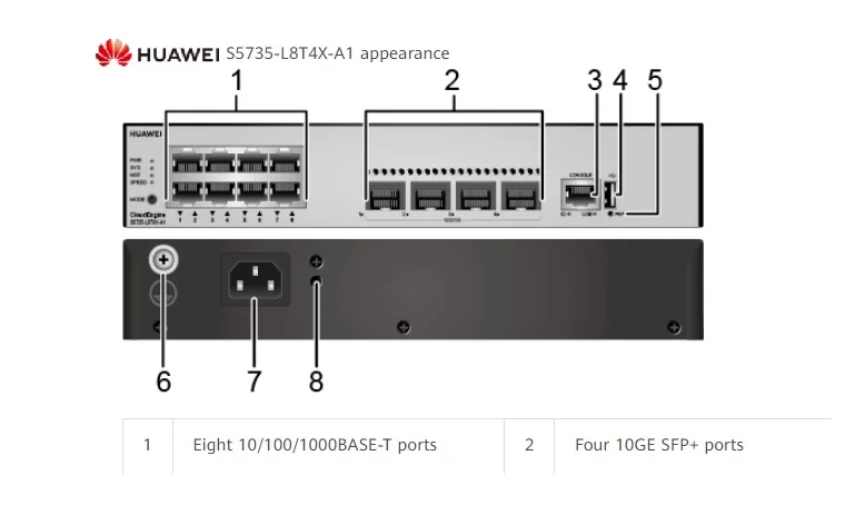 | Description | S5735-L8T4X-A1 (8*10/100/1000BASE-T ports, 4*10GE SFP+ ports, AC power) |